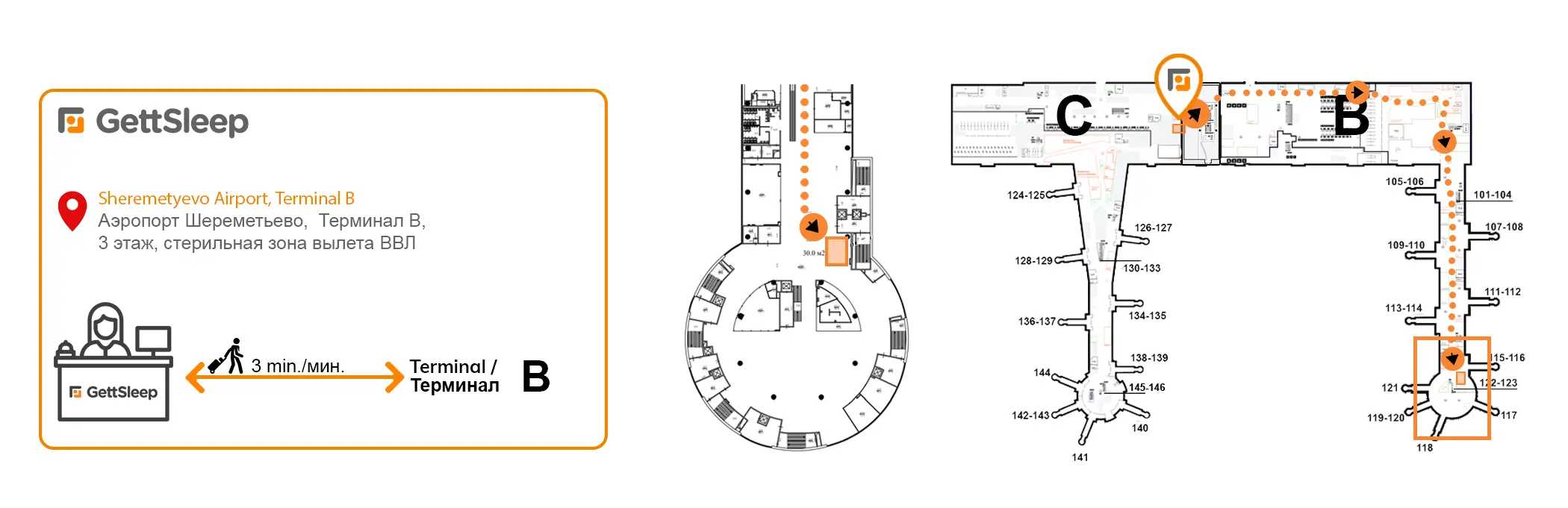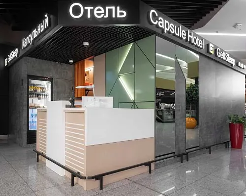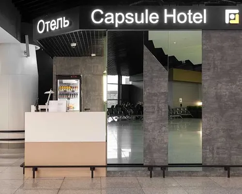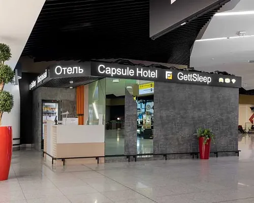 - → Terminal B (common area) — 22 capsule rooms before passport control. Single and double capsules, mini-rooms. 24/7 booking from 3,600₽ for 4 hours.