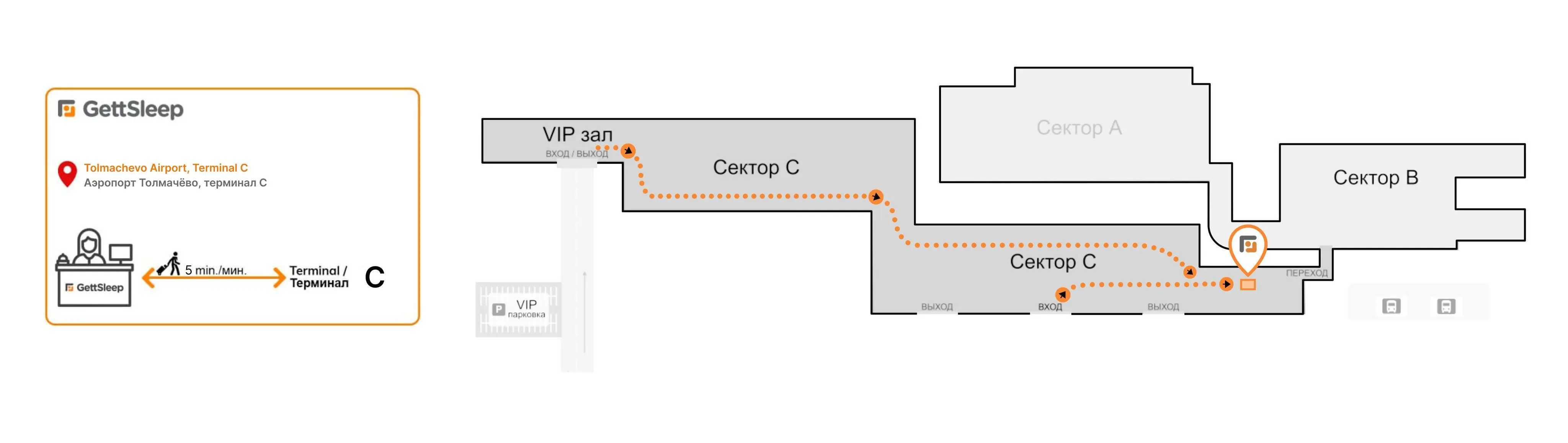 Capsule hotel “GettSleep” is located on the 1st floor of Domestic Line Terminal C of Tolmachevo Airport. So that you can easily find us, you need to turn right at the S7 counter, go past the Magnit store and the MTS cellular communication store, to go to sector B and expose the IL2 connector. On the left side of us is the representative office of the Astech Service company, and on the right is the Pharmacy.