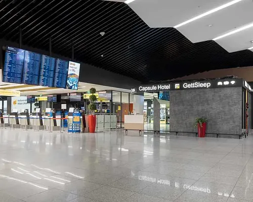 GettSleep network at Sheremetyevo — 4 hotels, 177 rooms across terminals. All capsule hotels located inside airport — no terminal exit needed: