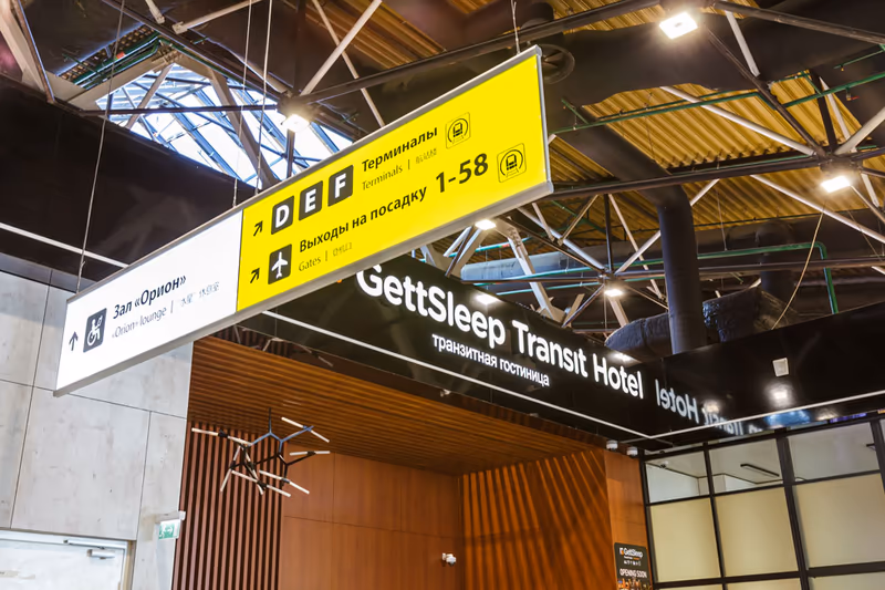 GettSleep sind keine Plastik-Schlafkapseln mit Einwegbezug auf einer duennen Matratze. Es sind vollwertige Mikrohotels in Flughaefen: ein richtiges Bett mit orthopaedischer Matratze, frische Bettwaesche fuer jeden Gast und gruendliche Zimmerreinigung zwischen den Aufenthalten. 213 Zimmer an 6 Standorten in Sheremetyevo und Tolmachevo — von der kompakten Solo-Kapsel bis zum Coupe-Minizimmer mit eigener Dusche.